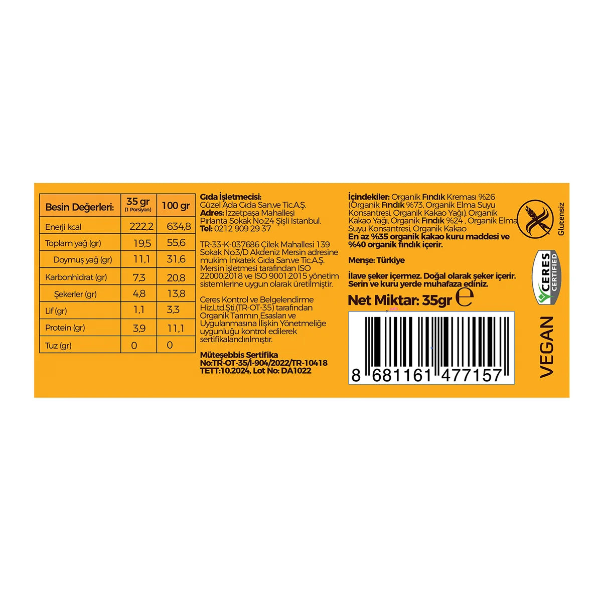 Ürünlerimizde esans, emülgatör, stabilizatör vb e kodeksi ürünler kullanılmadığı gibi tamamen el işçiliği ile üretilmiştir. Halihazırda alışık olduğumuz ve yaygın olarak görülen, şeker, koruyucu ve katkı maddesi içeriğiyle satılan ürünlerden farkı Türkiye de ilklere imza atan ürünümüz saf ve katkısız olmasıyla beraber, organik tarım sertifikalıdır. %100 Glutensiz bir işletme olduğumuz için bu ürünümüzde de gluten bulaşması bulunmamaktadır. İlaveten işletmelerimizde hayvansal gıda girişi olmadığından Vegan tüketicilere uygundur.